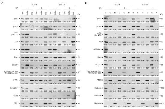 Gallic acid (GA) changes the lipid raft membrane localization of p85α, p110α, Ras-related C3 botulinum toxin substrate 1 (Rac1), protein kinase B (Akt), and phosphatase tensin homolog deleted on chromosome 10 (PTEN). (A,B) Tongue squamous carcinoma (TSC) cells were treated with vehicle (−) or GA (20 μM) for 36 h. Detergent-resistant membrane (DRM) and detergent-soluble (DS) fractions were prepared by flotation on a sucrose density gradient. Subcellular plasma membrane (M), cytosolic (C), and nuclear (N) fractions were separated by differential centrifugation. The levels of the indicated proteins in the lysates of vehicle- or GA-treated whole cell (WCL), DRM, DS, M, C, and N fractions were determined by Western blot analysis using specific antibodies. Antibodies against cadherin, α-tubulin, and nucleolin were used as internal controls for the plasma membrane, cytosol, and nucleus, respectively. β-Actin was used as an internal control for sample loading. The values above the figures represent relative density of the bands normalized to β-Actin.