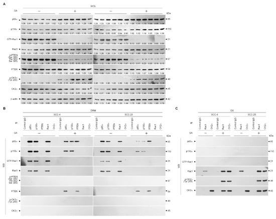 Gallic acid (GA) induces formation of inactive Ras-related C3 botulinum toxin substrate 1 (Rac1)–phospho (p)-casein kinase 2α (CK2α) (Tyr 255) and lipid raft-associated p85α–unphosphorylated phosphatase tensin homolog deleted on chromosome 10 (PTEN) complexes (A–C) Tongue squamous carcinoma (TSC) cells were treated with vehicle (−) or GA (20 μM) for 36 h. The levels of the indicated proteins in the lysates of vehicle- or GA-treated whole cell lysates (WCL) were determined by Western blot analysis using specific antibodies. The values above the figures represent relative density of the bands normalized to β-Actin. Coimmunoprecipitation of p85α, p110α, Rac1, PTEN, and CK2α was performed using the detergent-resistant membrane (DRM) and detergent-soluble (DS) fractions prepared from the cells treated as described above. The antibody used for coimmunoprecipitation is indicated at the top. The proteins from the immunoprecipitated complexes were detected using Western blotting with specific antibodies. Normal IgG was used as a control for antibody specificity.