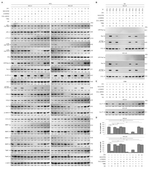 2.4. Formation of Inactive Rac1-p-CK2α (Tyr 255) Complexes by GA-Induced C-Src Activation Attenuates Akt-Mediated Glut-1 Membrane Localization, and Suppresses MMP-2/-9-Mediated Cell Invasion