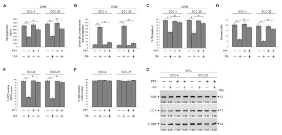 Gallic acid (GA)-induced cellular-Src (c-Src) activity confers perturbation of the lipid homeostasis of lipid raft membranes by suppressing glucosylceramide synthase (GCS) activity. Tongue squamous carcinoma (TSC) cells were treated with either vehicle (−), GA (20 μM), 1-(1,1-dimethylethyl)-3-(4-methylphenyl)-1H-pyrazolo[3,4-d]pyrimidin-4-amin (PP1) (6 μM), or GA (20 μM) plus PP1 (6 μM) for 36 h. (A–F) Cell viability was determined by the flow cytometric analysis of PI uptake. The lipids were extracted from the detergent-resistant membrane (DRM) fractions, and cholesterol, sphingolipid, and ceramide were quantitated by Amplex Red Cholesterol Assay Kit and thin-layer chromatography, respectively. Ceramide concentrations were normalized to phospholipid phosphate. The value of cellular glucose was analyzed using glucose assay kit. Acid sphingomyelinase (ASM) activity was determined by Acidic Sphingomyelinase Assay Kit. GCS activity was measured by addition of NBD-ceramide via thin-layer chromatography (TLC) separation. The values are presented as the means ± standard error (S.E.M.) of three independent experiments. * p < 0.05: significantly different from vehicle (−) or GA-treated cells. (G) The levels of the indicated proteins in the cell lysates were determined by Western blot analysis with specific antibodies. β-Actin was used as an internal control for sample loading. The values above the figures represent relative density of the bands normalized to β-Actin.