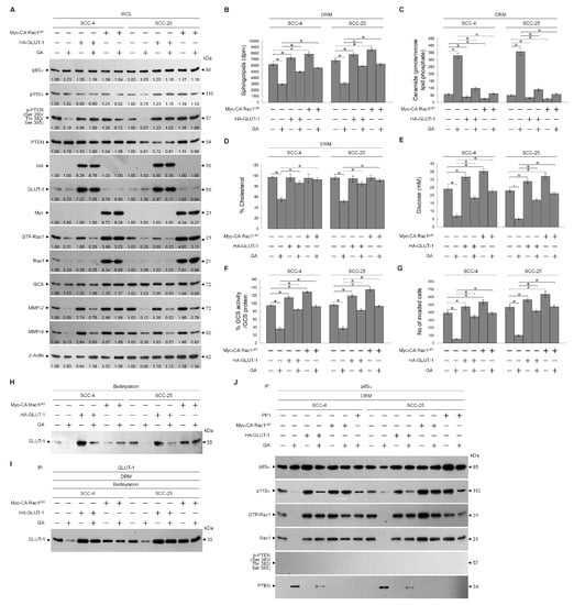 Ectopic expression of hemagglutinin-epitope-tagged glucose transporter-1 (HA-GLUT-1) or Myc-tagged constitutively active form of Ras-related C3 botulinum toxin substrate 1L61 (Myc-CA Rac1L61) overcomes gallic acid (GA)-induced formation of p85α–unphosphorylated phosphatase tensin homolog deleted on chromosome 10 (PTEN) and inhibition of GLUT-1-mediated lipid raft sphingolipid homeostasis and cell invasion. At 12 h after transfection with the HA-GLUT-1-, Myc-CA Rac1L61-expressing plasmids or empty vector control, the cells were treated with vehicle, GA (20 μM), or 1-(1,1-dimethylethyl)-3-(4-methylphenyl)-1H-pyrazolo[3,4-d]pyrimidin-4-amin (PP1) (6 μM) for an additional 36 h. (A) The levels of the indicated proteins in the cell lysates were determined by Western blot analysis with specific antibodies. β-Actin was used as an internal control for sample loading. The values above the figures represent relative density of the bands normalized to β-Actin. (B–F) The lipids were extracted from the DRM fractions, and cholesterol, sphingolipid, and ceramide were quantitated by Amplex Red Cholesterol Assay Kit and thin-layer chromatography, respectively. Ceramide concentrations were normalized to phospholipid phosphate. The value of cellular glucose was analyzed using glucose assay kit. Acid sphingomyelinase (ASM) activity was determined by Acidic Sphingomyelinase Assay Kit. Glucosylceramide synthase (GCS) activity was measured by addition of NBD-ceramide via thin-layer chromatography (TLC) separation. The values are presented as the means ± standard error (S.E.M.) of three independent experiments. * p < 0.05: significantly different from vehicle (−) or GA-treated cells. (G) The invaded cell numbers were assessed by the Matrigel invasion assays. The values are presented as the S.E.M. of three independent experiments. * p < 0.05: significantly different from vehicle (−) or GA-treated cells. (H) Biotinylated proteins were pulled down using streptavidin agarose beads. The biotin-streptavidin complexes were immunoblotted with GLUT-1 antibody. (I) The GLUT-1 antibody used for co-immunoprecipitation of cell surface-biotinylated protein from the detergent-resistant membrane (DRM) fractions is indicated at the top of the figure. (J) The p85α antibodies used for co-immunoprecipitation are indicated at the top of the figure. The proteins in the immunoprecipitated complexes from the DRM were analyzed by Western blot using specific antibodies.