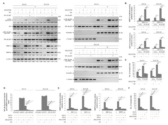 Both assays were performed as previously described [60]. Briefly, the pGL3-basic (vector), pGL3-control (control), or MMP-2 promoter plasmids were co-transfected with a β-galactosidase expression vector (pCH110) (10:1) into cells using Lipofectamine 2000 following the manufacturer’s protocols (Invitrogen Life Technology, Carlsbad, CA, USA). After 12 h of post transfection, the cells were treated with vehicle, GA, or inhibitor for additional 36 h. For the overexpression assays, cells were transfected with MMP-2 or MMP-9 promoter plasmid and plasmid expressing NF-κB p65 using Lipofectamine 2000. The β-galactosidase expression vector pCH110 was included as an internal control. After 12 h of transfection, cells were treated with vehicle or GA for additional 36 h. The cell lysates were harvested, and the protein expression and luciferase activities were assessed as previously described [60].