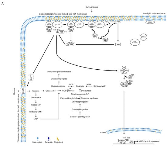 The homeostasis of the biological properties of lipid raft membranes by facilitating synthesis of sphingolipids was tightly regulated by PI3K-Rac1-Akt-regulated GLUT-1-mediated glycolytic metabolism, as evidenced by decreased Akt (Ser 473) phosphorylation and Rac1 activation together with heightened level of lipid raft membrane ceramide, decreased sphingolipid, cholesterol, and GLUT-1 levels in the lipid raft membranes, loss of glucose and GCS activity, and reduced MMP-2/-9 expression and invasive activity in TSC cells treated with LY294002. The formation and lipid raft membrane association of the PTEN and p85α complexes induced by substitution of the cholesterol of the lipid rafts with ceramide confers attenuation of PI3K-Akt signaling, and this finding is consistent with previous studies [3,8,35,58]. The existence and role of Akt-regulated GLUT-1-mediated sphingolipid synthesis are providing new insights into the dynamic process occurring in the compartmental regulation of PI3K-Rac1-Akt signal molecules.