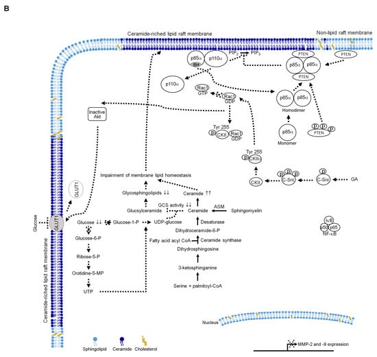 PI3K-Rac1-Akt-mediated signaling is dependent upon the structure and function of lipid raft membrane [35]. Cholesterol and sphingolipid have shown to be critical for maintaining lipid raft structure [36,37]. Changes in composition of lipid rafts by increasing ceramide level perturb the integrity and dynamics of membranes, resulting in impaired cellular signaling and cell migration [38]. We examined whether structural composition of the lipid raft membranes was affected by GA. Caveolin-1- and CD55-enriched DRM fractions were analyzed for lipid components. Treatment with GA did reduce the sphingolipid and cholesterol contents of lipid raft membranes but increased ceramide generation (Figure 6A–C). No difference was observed on both acid sphingomyelinase (ASM) protein level and activity, when cells were treated with GA (Figure 6F,G). The results indicated that evaluation of ceramide level by GA was not due to an increase in ASM activity. Glucosylceramide synthase (GCS), converting ceramide to glucosylceramide, is an important enzyme for the synthesis of glycosphingolipids [39]. The level of GCS protein was not altered (Figure 6G), whereas this enzyme activity was reduced by GA (Figure 6E). The co-treatment of PP1 with GA returned the levels similar to those of sphingolipid, cholesterol, and ceramide in the lipid raft membranes of vehicle-treated cells (Figure 6A–C). GA-induced reduction of cellular glucose and GCS activity were restored to a similar level as cells treated with vehicle in combination of PP1 (Figure 6D,E). We next investigated if the reduction in sphingolipids and cholesterols and the elevation in ceramide synthesis by GA could be explained by impaired membrane targeting of GLUT-1 or Rac1 inactivation. HA-tagged GLUT-1 (HA-GLUT-1) or Myc-tagged constitutively active form of Rac1 (Myc-CA Rac1L61) expression construct was transfected into cells, and effects of their expression on GA-treated cells were examined. As shown by Western blot analysis, HA-GLUT-1 or Myc-CA Rac1L61 construct was able to achieve a higher level of GLUT-1 or Rac1 expression than that of the control vector alone. The expressions of HA-GLUT-1 and Myc-CA Rac1L61 proteins were verified by specific detection of HA- and Myc-tagged proteins (Figure 7A). An increased detection of the cell surface-associated GLUT-1 on the vehicle-treated ectopic HA-GLUT-1 expression was confirmed by Western blot analysis of streptavidin-agarose bead-bound protein from biotinylated cells (Figure 7H). Immunoprecipitation of cell surface-biotinylated proteins from the DRM fractions isolated with streptavidin-agarose beads using antibody specific for GLUT-1 showed an increase in the amount of GLUT-1 in the lipid raft membranes of vehicle-treated HA-GLUT-1-transfected cells, when compared with cells transfected with vehicle control (Figure 7I). Increased lipid raft membrane targeting of GLUT-1 by ectopic expression blocked the decrease of cellular glucose, sphingolipid, cholesterol, GCS activity levels and increase of ceramide induced by GA (Figure 7B–E), which simultaneously restored levels of p85α-p110α complexes and aborted p85α-unphosphorylated PTEN complex formation (Figure 7J). GA-induced inhibitions of MMP-2/-9 expression and cell invasion were overcome by ectopic expression of HA-GLUT-1 (Figure 7A,G). When Myc-CA Rac1L61 expressed in GA-treated cells, lipid raft membrane targeting of p85α-p110α complexes and GLUT-1 was restored, and the invasiveness and MMP-2/-9 expression properties were dramatically recovered (Figure 7A,G–J). GA-induced alterations in levels of sphingolipid, cholesterol, ceramide, and GCS activity were reversed by Myc-CA Rac1L61 overexpression (Figure 7B,D–F). These data suggest that invasion was suppressed in GA-treated cells by c-Src-dependent suppression of Rac1 activation. Therefore, cells losing Rac1 activity showed a decreased constitutive activity of Akt, which failed to maintain GLUT-1-mediated sphingolipid homeostasis of the lipid raft membranes and deregulated MMP-2/-9-mediated cell invasion.