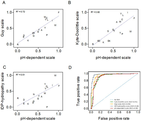 We compared the pH-dependent hydropathy (pH-dependent) scale with the Kyte–Doolittle, Guy, and IDP–Hydropathy scales. First, we normalized the four scales between 0 and 1, assigning a value of 1 to the highest hydrophobicity. Then, we calculated the values for the pH-dependent scale at pH 7.0. We found the highest correlation with the Guy scale (R2 = 0.72), followed by the Kyte–Doolittle (R2 = 0.60) and the IDP–hydropathy (R2 = 0.51) scales (Figure 1A–C). The correlation between the Guy and Kyte–Doolittle scales is R2 = 0.78. In contrast, as it happens for the pH-dependent scale, the correlation between the IDP–hydropathy and the Guy or the Kyte–Doolittle scales is low, with R2 = 0.52 and R2 = 0.33, respectively. These low correlations stem mostly from the fact that, counter-intuitively, the IDP–hydropathy scale considers Pro as the most hydrophilic residue, with a value of 0 in our normalized scale. Removing Pro from the correlation between the pH-dependent and IDP–hydropathy scales increases R2 to 0.70 and arbitrarily assigning this residue a value of 0 in the pH-dependent scale (pH–Pro-corrected scale) results in an R2 = 0.74 (Supplementary Figure S1A).