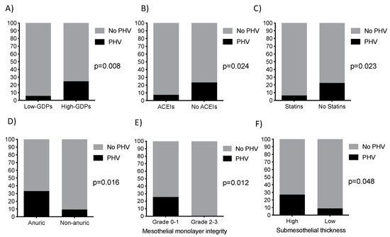 Prevalence of PHV was significant lower in patients using (A) biocompatible peritoneal dialysis (PD) solutions, (B) angiotensin converting enzyme inhibitors (ACEIs) and (C) statins. Patients with preserved residual renal function (D), peritoneal mesothelial integrity (E) and lower peritoneal fibrosis (F) also showed significantly lower PHV prevalence.
