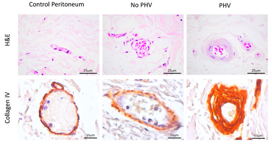 Collagen IV immunohistochemical analysis in peritoneal biopsies. A representative hematoxylin–eosin (H&E) image shows subendothelial thicknesses of the basement membrane in a PHV lesion. Immunostaining images show a PHV strongly stained for collagen IV in the basement membrane, as compared to a control sample or a PD-treated patient without PHV.