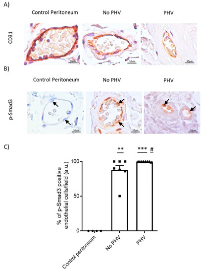 Immunohistochemical staining for CD31 and p-Smad3. (A) Endothelium of control peritoneal samples and PD-treated biopsies without PHV lesions present strong staining for CD31. On the contrary, endothelial cells of biopsies with PHV showed low intensity staining for CD31. (B) Endothelial cells from healthy biopsies were p-Smad3-negative. Nuclear p-Smad3 staining was found in the peritoneal endothelium of capillaries from PD-treated patients without and with PHV. Arrows point to endothelial cells. (C) pSmad3-positive endothelial nuclei were quantified and expressed as percentage of endothelial cells showing p-Smad3 positive staining per field. Bar graphic represents the mean ± SEM. ** p < 0.01 vs. control group; *** p < 0.005 vs. control group; # p < 0.05 vs. no PHV group.