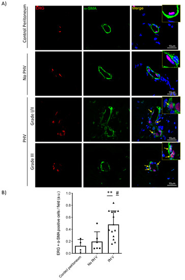 Detection of endothelial-to-mesenchymal transition in biopsies showing PHV. (A) Dual immunofluorescence staining representative pictures for ERG (endothelial marker) (red) and α-SMA (myofibroblast marker) (green) in a peritoneal capillary from a control sample, a PD-treated patient without PHV and patients presenting PHV at different degrees. Arrows point to double positive (ERG + α-SMA) endothelial cells indicating EndMT. Of note, perivascular smooth muscle cells are strongly marked for α-SMA in a normal vessel and in a PD patient without PHV. Perivascular smooth muscle cells seem to disappear in high-grade PHV biopsies. Insets show higher magnification of the delimited areas. (B) Double positive (ERG + α-SMA) endothelial cells were quantified. Graphic represents individual data points and the mean ± SEM. ** p < 0.01 vs. control group; # < 0.05 vs. No PHV group.