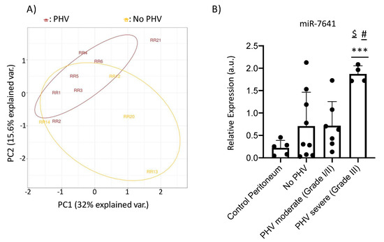 (A) Principal component analysis showing dissociation between PHV and no PHV groups. (B) Relative miR-7641 expression between samples. Data are represented as 2E(-dCt) as a measure of the relative amount of miR764. Graphic represents individual data points and the mean ± SEM. *** p < 0.001 vs. Control peritoneum, # p < 0.01 vs. No PHV group; $ p < 0.005 vs. PHV moderate group.