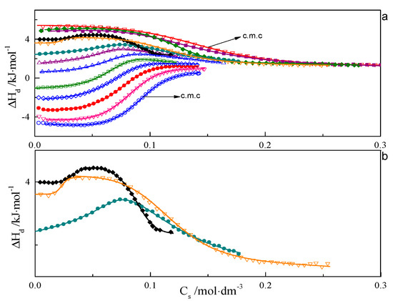 ITC curves for aqueous solutions of surfactants 8-8-8 and 8-14-8 are shown in Figure 1 and Figure 2. All experimental curves for investigated systems wth s = 6, 7, 8, 9 are available in the Supporting Information—Figures S16–S18. For each surfactant system, it was observed that an increase in temperature causes a gradual change in the course of ΔHd = f(C) from endothermic to exothermic. Shapes of the dilution enthalpy curves of surfactant with a spacer with ≤9 carbon atoms for temperature regions: 283.15–303.15 and 328.15–343.15 K are almost sigmoidal with noticeable one inflection point which corresponds to the c.m.c region. For a compound with s = 14, the mentioned temperature regions are shifted and appear at 283.15–298.15 and 318.15–343.15 K. It is worth noting that the micellisation region is less sharp at 343.15 K than at 298.15 K. In the case of the 288.15–303.15 K region, the micellisation occurs at lower concentrations in comparison to that of the 328.15–343.15 K range. The shape of function ΔHd = f(C) for the transition area: 308.15–323.15 K for the investigated surfactant with s ≤ 9 and 303.15–313.15 K in case s = 14 is unusual and resembles two conjoined sigmoidal curves—Figure 1b and Figure 2b.