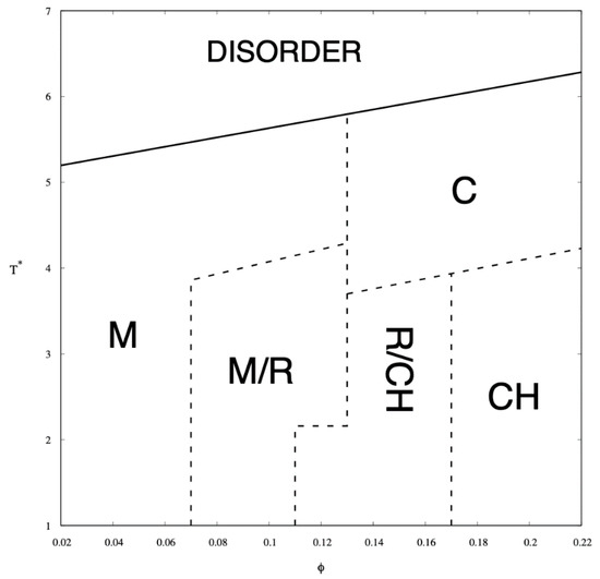 Monte Carlo phase diagram of A8-B2-A6-B2-A8 pentablock colomymer in a selective solvent as a function of the chain volume fraction, φ, and the reduced temperature, T*. Solid line is the approximate critical micelle temperature (CMT)/order–disorder transition (ODT) line while the dashed lines indicate transitions between the following arrangements: micellar (M), rod-like elongated micellar (R), 3-dimensional channels (CH), and cylindrical (C).
