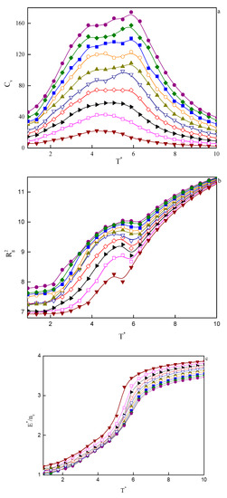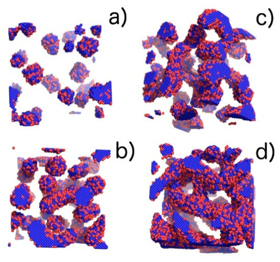 In the phase diagram shown in Figure 4, the solid line represents the approximate critical micelle temperature (CMT) and the order–disorder transition (ODT) line. For very low densities, we can talk about CMT, while at higher densities we deal with ODT. Below the CMT/ODT line, a series of phases separated by dashed lines is observed. These lines are approximate due to non-sharp transitions between the individual arrangements. This is the result of discrete values of volume fractions, φ, and temperatures, T*, we simulated, and the narrow φ-range areas where the coexistence of two neighboring phases is observed. In the lowest volume fractions spatially disordered micelles (M) are observed. In a weak segregation limit (WSL), that is, at the temperatures close to the ODT, the micelles shape becomes cylinidrical (C) as the volume fraction exceeds 0.12. At lower temperatures, on the other hand, an increase in volume fraction of the copolymer leads to the micellar phase becoming enriched with elongated rod-like micelles (M/R). As the system reaches φ ≈ 0.12, the ever-increasing proportion of the R phase causes the rodlike micelles to begin to combine and form three-dimensional Y-channels (R/CH). Finally, when the copolymer volume fraction exceeds φ ≈ 0.16, the system turns into the pure three-dimensional Y-channels phase (CH). In Figure 5, we present a selection of representative configuration snapshots showing the above evolution of phases, along with the increasing volume fraction of the copolymer. The blue colour denotes A-blocks (tails and spacers) while red refers to Bs (gemini heads). Towards the increasing φ we observe pure micellar phase (Figure 5a), elongated rod-like micelles (Figure 5b), mix of rod-like micelles and Y-channels (Figure 5c), and pure three-dimensional Y-channels (Figure 5d) respectively. We also report an aggregation number, Na, specific heat, CV, mean-squared radius of gyration, and the reduced energy per chain, , where is the number of chains in a given volume fraction. The quantitative dependence of the aggregation number Na on the volume fraction, φ, and the reduced temperature, T* is illustrated in Figure 6. In Figure 6a, we show only two datasets for the temperatures T* = 1.3 and 3.0 due to emphasize the function course. In Figure 6b, we show in turn Na on a logarithmic scale for clarity purposes. We can observe that in a weak segregation limit (circles) the micelles are larger than in a low-temperature strong-segregation limit (triangle).