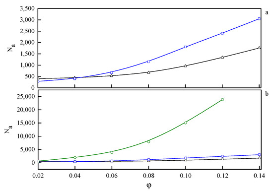 The dependence of the aggregation number, Na, on the volume fraction, φ, for three selected temperatures: T* = 1.3 (Δ—triangle), T* = 3.0 (□—squares), and T* = 4.7 (○—circles). On (a) the highest temperature is omitted to emphasize the behaviour at lower temperatures. On (b) on the other hand Na is on a logarithmic scale for clarity purposes.