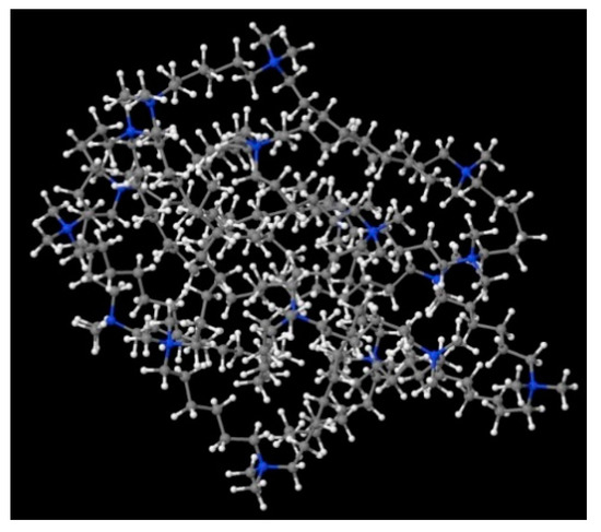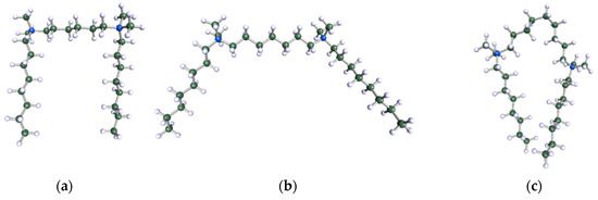 In order to understand the possible structure of a gemini surfactant micelle, simulations were performed using a semi-empirical PM7 approach as implemented in the Mopac program [38]. Input micelles were composed of molecules, whose geometries had been previously optimised by the Density Functional (DFT) method (triple-zeta basis def2-TZVPPD, B3LYP hybrid functional with Caldeweyer–Grimmie D4 dispersion corrections), taking into account the cationic character of the surfactant “heads” [39]. Such geometries are usually non-unique, as, e.g., various conformations are possible within eight-carbon terminal chains, and this was taken into account in the simulations. Gemini surfactant molecules also exhibit a clear odd–even effect with respect to the length of the spacer chain, as shown in Figure 9. Moreover, a longer spacer facilitates other than “all-trans” conformations thereof, enabling hydrophobic attraction of terminal chains. It is now clear that whatever aggregates are formed in the solution, it is not possible that all tails point inwards, with “heads” organized in a kind of shell. A sample micelle composed of nine 8-6-8 molecules is shown in Figure 10.