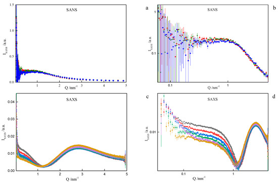 Observed Small-Angle Neutron Scattering (SANS) (a) and (b) and X-ray Scattering (SAXS) (c) and (d) spectra for the cationic dimeric 8-6-8 surfactant system for Cs = 0.22 mol dm−3 at: ■—293.15 K, ●—298.15 K, ▲—303.15 K, ▼—308.15 K, ♦—313.15 K, ◄—318.15 K.