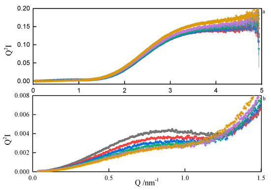 Kratky plots (a) and zoom (b) from SAXS analyses of 8-6-8 surfactant system at Cs = 0.22 mol dm−3 at: ■—293.15 K, ●—298.15 K, ▲—303.15 K, ▼—308.15K, ♦—313 K.15, ◄—318.15 K.