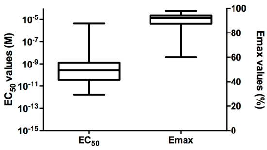 Cell sensitivity data from the 60 healthy volunteers were grouped also on the basis of the blood group, as reported in Figure 3C,D. Similar to the comparison between genders, the non-parametric analysis for unpaired data (Kruskal–Wallis test) followed by the Dunn’s post-test did not show any significant difference between blood groups (p > 0.05), considering both EC50 and Emax values, suggesting that the blood group does not affect the cells sensitivity towards PLTX toxicity.