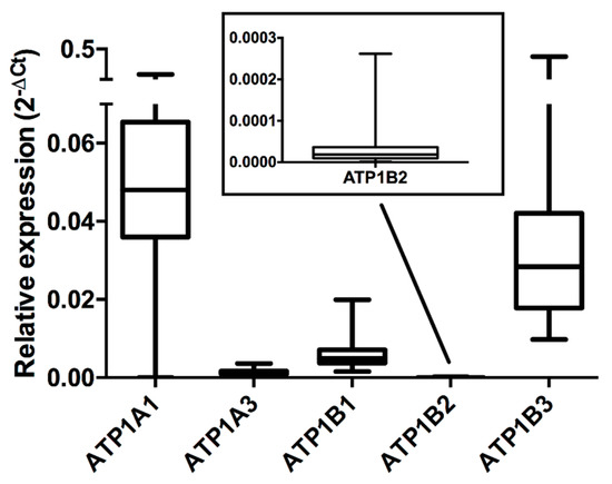 Relative expression data of the Na+/K+-ATPase isoforms of male volunteers (68.3%) were compared to those of female volunteers (31.7%; Supplementary Figure S1). For the α isoforms, the median relative gene expressions of α1 (ATP1A1) in males and females were equal to 0.0481 (interquartile range: 0.0383–0.0649) and 0.0412 (interquartile range: 0.0336–0.0688), respectively, whereas the median relative gene expressions of α3 (ATP1A3) in males and females were equal to 0.0013 (interquartile range: 0.0009–0.0018) and 0.0013 (interquartile range: 0.0009–0.00145), respectively. Considering the β isoforms, the median relative gene expressions of β1 isoform (ATP1B1) in males and females were equal to 0.0049 (interquartile range: 0.0037–0.0072) and 0.0045 (interquartile range: 0.0040–0.0071), respectively; for the β2 isoform (ATP1B2) the median relative gene expression was 1.61 × 10−5 for males (interquartile range: 0.60–3.26 × 10−5) and 2.22 × 10−5 for females (interquartile range: 1.14–3.96 × 10−5), whereas, the median relative gene expression for the β3 isoform (ATP1B3) was 0.0299 for males (interquartile range: 0.0188–0.0437) and 0.0212 for females (interquartile range: 0.0148–0.0408). For all the isoforms considered, the non-parametric analysis for non-normalized unpaired data (Mann–Whitney test) showed no significant difference (p > 0.05) between males and females, suggesting the absence of differences in the gene expression of Na+/K+-ATPase isoforms between genders. In addition, the non-parametric Spearman’s correlation analysis between the relative gene expressions of the Na+/K+-ATPase isoforms and age of the enrolled healthy volunteers showed a significant negative correlation only for the relative expression of the ATP1B3 gene (rho = −0.30; p = 0.021), suggesting that as the age increases, ATP1B3 expression decreases. On the contrary, no significant correlations were determined by the non-parametric correlation analysis between age and the relative gene expressions of the other isoforms.