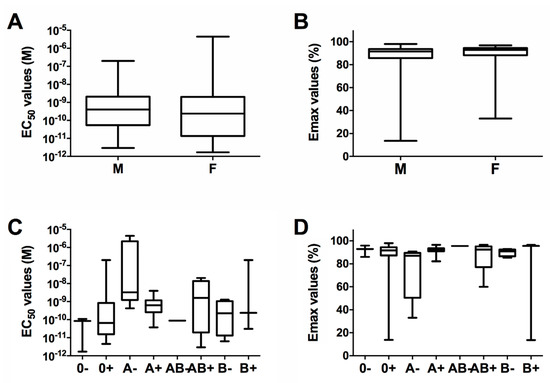 To analyze whether the demographic data of each healthy volunteer (gender, age, and blood group) are related to differences in their monocytes sensitivity to PLTX, in vitro cytotoxicity data (EC50 and Emax) were compared to the selected population parameters. Considering the gender, sensitivity values were grouped between males and females and the relevant distributions of EC50 and Emax values are shown in Figure 3A,B. The median EC50 values for males and females were equal to 4.0 × 10−10 M (interquartile range: 0.5–20.9 × 10−10 M) and 2.4 × 10−10 M (interquartile range: 0.1–20.3 × 10−10 M), respectively. The median Emax values for males and females were 91.5% (interquartile range: 87.8%–93.7%) and 92.9% (interquartile range: 88.2%–94.6%), respectively. The non-parametric analysis for unpaired data (Mann–Whitney test) did not show any significant difference between the distributions of in vitro sensitivity parameters in males versus females (p > 0.05), suggesting that the gender does not influence the cells sensitivity towards PLTX toxicity.