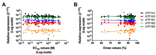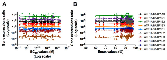 Dispersion graphs of the ratios of relative gene expressions of the different Na+/K+-ATPase subunits isoforms in function of the EC50 (A) or the Emax (B) values, and relevant regression lines. Each point represents the mean EC50 or Emax values recorded for each healthy volunteer.