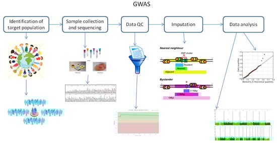 It is known that GWAS assess and analyze differences or variations in DNA sequences across the human genome to detect genetic risk factors of diseases prevalent in a population under investigation. The ultimate goal of GWAS is to predict either disease risk or disease progression by utilizing genetic risk factors to define the biological basis of disease susceptibility. This also enables the development of innovative and preventative therapeutic strategies [2]. There are two fundamental concepts underlying GWAS, including linkage disequilibrium (LD) and a common disease–common variant (CD–CV) hypothesis. These concepts will be discussed in more detail later on in this review. A basic technical workflow for a typical GWAS is presented in Figure 1.