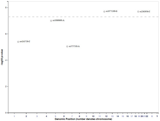 19. Michailidou, K.; Hall, P.; Gonzalez-Neira, A.; Ghoussaini, M.; Dennis, J.; Milne, R.L.; Schmidt, M.K.; Chang-Claude, J.; Bojesen, S.E.; Bolla, M.K.; et al. Large-scale genotyping identifies 41 new loci associated with breast cancer risk. Nat. Genet. 2013, 45, 353–361, 361e1–361e2. [Google Scholar] [CrossRef]