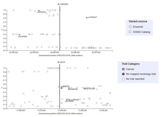 Figure 4. Correlations of the two most studied SNPs associated with triple negative breast cancer and other nearby SNPs identified following analysis of the GWAS catalogue. Abbreviations: SNPs, single nucleotide polymorphisms; GWAS, Genome-wide association studies.