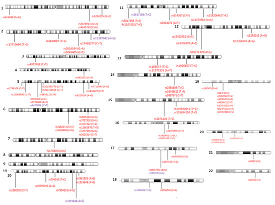 Figure 5. Locations of TNBC-related SNPs distributed across all somatic human chromosomes. In red color, SNPs related to TNBC risk, and in violet color, SNPs associated with different outcomes of TNBC (taken from Table S1). Abbreviations: A, adenine; C, cytosine; T, thymine; G, guanine.