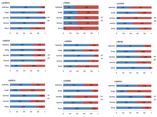 Among all SNPs associated with TNBC, only those SNPs with the most significant differences detected in subpopulation frequencies are presented in Figure 6. The divergent bar graphs demonstrate differences in the composition of allele frequencies exhibited within each of the five subpopulations: African, American, East-Asian, European, and South-Asian. This finding emphasizes the importance of knowledge of allele frequencies in subpopulations, especially when undertaking a GWAS.