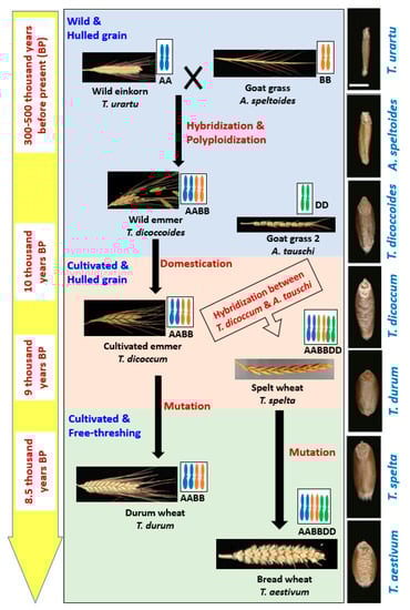 Free-threshing durum (Triticum durum, 2n = 4x = 28, genome AABB) and bread wheat (T. aestivum, 2n = 6x = 42, genome AABBDD) were originated from enclosed cultivated emmer and spelt wheat, respectively, around 8500 years ago through natural mutation [2]. Clearly, emmer wheat played the central role of wheat evolution. Different opinions also found in the literature which explained the origin of bread wheat as a crossing product between (i) the hulled cultivated emmer (T. dicoccum), (ii) free-threshing the T. durum, or (iii) the free-threshing Triticum parvicoccum with the Ae. Tauschii [23,24]. However, the crossing took place probably 9000 years ago in south or west of the Caspian Sea, just after spreading of emmer wheat cultivation from Fertile Crescent into the natural habitat of Ae tauschii [25,26]. These studies further strengthened the central role status of emmer wheat in the evolutionary process.
