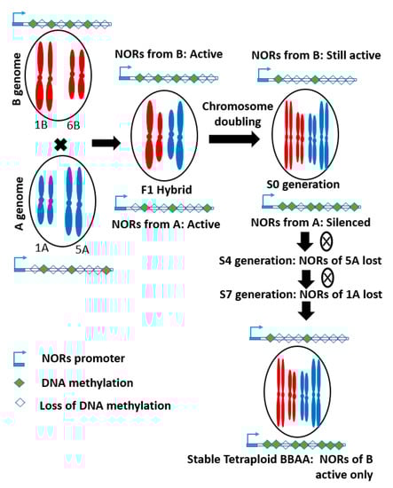 Nucleolus organizing regions (NORs), also named as ribosomal DNA (rDNA) loci are present on different chromosomes (1A, 5A, 1B, 6B, and 5D) of diploid wheat [53]. This gene is composed of long tandem repeats that clustered on the chromosome and translated into important components of the chromosome [7]. Its activity is associated with the size of the intergenic regulatory region and the status of cytosine methylation [54,55]. However, NORs from the A genome are largely lost during the evolution of synthetic tetraploid wheat, due to asymmetric transcription and epigenetic modifications during polyploidization (Figure 2). In hybrids, NORs from both parents were expressed. However, after chromosome doubling, it became silenced in one parent (A genome), due to increased DNA methylation. In this process, a pair of NOR on the 5A chromosome were deleted first, the gradual elimination of another pair from the 1A chromosome, resulted in complete loss of NORs from the A genome by S7 generation. Therefore, in stable synthetic tetraploid wheat, rDNA from only the B genome was present. In the case of bread wheat, the rDNA loci form both A and D genomes were largely eliminated during evolution [7]. Additionally, genome wide transcription analysis revealed that gene expression in synthetic bread wheat is parentally dominant and only one of the parental genomes determines morphological traits and ecological adaptations [46,51,54,56].