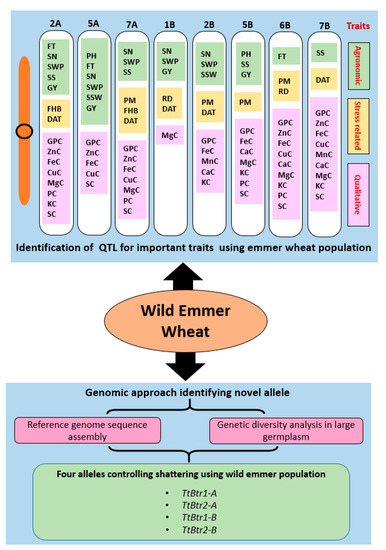 Utilization of WEM wheat through different methods. Top portion indicates already identified QTL from WEM for important agronomic, stress-related, and nutrients and quality and bottom portion indicates genomic approach used to identify novel allele of spike brittleness from WEM. Note: FT = Flowering time; SN = Seed number; SWP = Seed weight per plant; SS = Seed size; GY = Grain yield; PH = Plant height; SSW = Single spike weight; FHB = Fusarium head blight; PM = Powdery mildew; RD = Rust disease; DAT = Drought adaptive traits; GPC = Grain protein content; ZnC = Zinc content; FeC = Iron content; CuC = Copper content; MgC = Magnesium content; PC = Phosphorus content; KC = Potassium content; SC = Sulphur content; MnC = Manganese content and CaC = Calcium content. TtBtr1-A and TtBtr2-A: loci on chromosome 3A for brittleness; TtBtr1-B and TtBtr2-B: loci on chromosome 3B for brittleness.