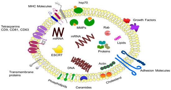 Exosomes belong to the large group of small extracellular vesicles, including oncosomes, microvesicles, exosomes and apoptotic bodies [13]. They vary in size considerably with a range of 30–100 nm and density of 1.13–1.19 g/mL [14,15]. Exosomes are carriers of numerous proteins, lipids and nucleic acids (Figure 1). The content of exosomes depends on the composition of the cells from which they originate [16,17,18]. Exosomes are secreted by both normal and pathological cells. The process of creating exosomes involves many stages. These include the gradual formation of interstitial vesicles (ILVs) within the intracellular multivascular body (MVB) and their secretion into the intercellular space as small exosomes [19]. This process can take place via three paths: with the participation of the endosomal sorting complex required for transport function (ESCRT), as a result of ceramide-dependent lateral phase separation and coalescence of tetraspanin-rich membrane microdomains (TEM) present in a raft, or with the participation of ALG-2 interacting protein X (ALIX) and lysobisphosphatidic acid (LBPA) [15,20,21]. These processes involve a significant amount of formed ILVs in exogenous biogenesis (ILVs are derived from cholesterol-rich MVBs). In addition, the vesicles participate in the biogenesis of lysosome-associated organelles in specialized cells and the transport of specific proteins to membranes, and are subject to degradation within lysosomes (IVLs derived from cholesterol-poor MVBs) [22,23]. Exosomes have been found in whole blood, plasma, cerebrospinal fluid, urine, semen, saliva, synovial fluid, milk, tears, nasal secretions and feces [24,25,26,27].