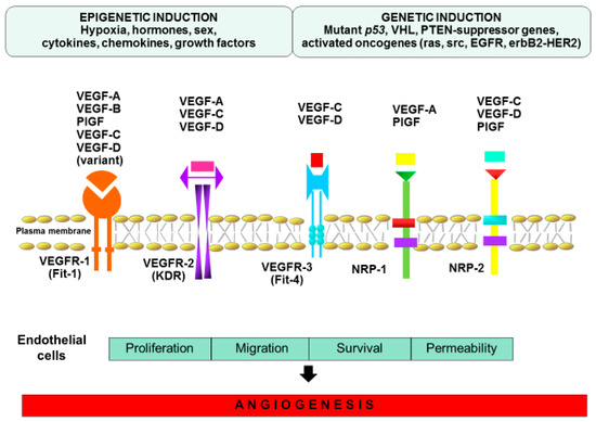 Regulators of angiogenesis are a very large and heterogenous group with a wide range, including polypeptides, metabolites and hormones that collaborate in order to form new blood vessels [70]. A major factor of angiogenesis under normal conditions and in a disease state is vascular endothelial growth factor A (VEGF-A) [71]. It is a member of the gene factors family, which includes VEGF-B, VEGF-C, VEGF-D, VEGF-E and placenta growth factor (PlGF). These factors show different affinities to tyrosine kinase receptors (VEGFR) -1, -2 and -3 [72]. VEGF-A may bind to VEGFR-2 (mainly occurring on blood vessel ECs) and contributing to the process of angiogenesis, whereas VEGF-C and -D preferentially bind to VEGFR-3, which is predominantly found on lymphatic ECs, resulting in proliferation of lymphatic vessels [71]. VEGF promotes the cancer stem cells’ functionality and may initiate tumorigenesis by activation of epithelial–mesenchymal transition (EMT) [73]. This leads to a loss of cell polarity and cytoskeletal changes, which cause an increase in cell motility and a decrease in cell adhesion through loss of E-cadherin and ZO-1 [74]. To allow endothelial cell migration and formation of capillary sprouts, basal membrane degradation must occur. For this process, matrix metalloproteinases, MMP-2, MMP-9, and urokinase plasminogen activator (uPA) are responsible [75]. Expression of membrane-type matrix metalloproteinases (MT–MMPs) promotes VEGF-mediated cell invasion. VEGF also induces vascular permeability, which may facilitate the escape of tumor cells into the bloodstream and promote distant metastases [76]. An interesting fact is that the role of PlGF in modulating angiogenesis process is not so obvious. PlGF may initiate cross-talk between VEGFR-1 and VEGFR-2 [77], while other studies reported its antiangiogenic properties [78] (Figure 2). Proteolysis mediated by plasmin (PLA) is an essential feature of angiogenesis and cell invasion [79]. Whereas antithrombin is a key inhibitor of the coagulation cascade, it may also have an anti-angiogenic function [80].