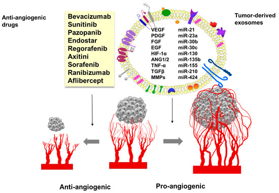 Angiogenesis and inflammation are processes that play important roles in the development of cancer, from the initiation of carcinogenesis, the carcinoma in situ stage, to the advanced stages of cancer [1]. Excessive abnormal angiogenesis has a central role in tumor progression. It is induced by an imbalance between pro- and anti-angiogenic factors, dominated by tissue hypoxia-triggered overproduction of vascular endothelial growth factor (VEGF) [2]. Proliferation and metastatic spread of cancer cells depends on an adequate supply of oxygen and nutrients and the removal of waste products [3]. Tumor cells utilize different strategies to communicate with neighboring tissues for facilitating tumor progression; one of these strategies is a release of exosomes [4,5]. Tumor cells, as well as immune cells, secrete exosomes that affect the activation of immune cells and immune surveillance [6]. Exosomes, harboring various cargoes that can accelerate angiogenesis, play an important role in cancer invasiveness [7]. According to numerous studies, by releasing exosomes, tumor cells are able to promote tumor epithelial–mesenchymal transition, angiogenesis, and immune escape [8]. Exosomes can shuttle diverse biomolecules like microRNAs, DNA fragments, proteins, lipids, and even pharmacological compounds from a donor cell to recipient cells [9]. There is evidence that noncoding RNAs, especially long non-coding RNAs (lncRNAs) and microRNAs, play important roles in the regulation of angiogenesis [10]. It has been shown that tumor vasculogenesis and progression after anti-angiogenic therapies (AATs) and anti-autophagic therapies are due to cross-talk between endothelial and tumor cells via VEGF-enriched exosomes [11]. Manipulation of angiogenesis has become an attractive approach for cancer therapy since the introduction of the first angiogenesis inhibitor, bevacizumab, for metastatic colorectal cancer therapy [12]. The implementation of anti-angiogenic strategies faces several pitfalls due to the potential involvement of multiple pro-angiogenic factors and modulatory effects of the innate and adaptive immune system [2]. This review will consider exosomes in the context of tumor angiogenesis and the limited efficacy of current anti-angiogenic approaches.