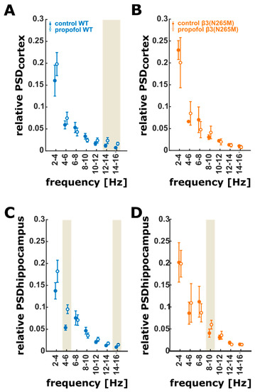 PSD error bar plots of the 2 Hz frequency ranges (mean ± sem). (A) LFP recorded from the cortex in the wild-type mice. Propofol has a significant and medium effect on the 12–14 Hz and a significant and strong effect on the 14–16 Hz (Hedges’ g: 1.01; CI: (0.38 to 1.96)) frequency range. In both frequency ranges, propofol causes an increase in relative power. (B) There is no significant effect of propofol on the PSD of LFP activity recorded from cortex in the β3(N265M) group. (C) In the hippocampal LFP recordings from wild-types, propofol significantly and strongly increased relative power in 4–6 Hz range and in the 14–16 Hz range (Hedges’ g: 0.90; CI: (0.26 to 1.78)). (D) Propofol caused a significant and strong increase in relative power in the 8–10 Hz range of LFP recorded from the hippocampus of the β3(N265M) mice. The ivory areas indicate significance, i.e., a 95% confidence interval of Hedge’s g exclusive 0; wild-type (n = 4), β3(N265M) knock-in mice (n = 3); PSD: power spectral density. LFP: local field potential, CI: 95% confidence interval.