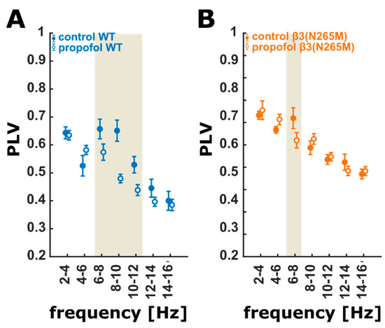 PLV for the wild-type (A) and β3(N265M) mutant recordings (B) for non-overlapping 2 Hz frequency bands. (A) Propofol strongly and significantly affects PLV in the 6–12 Hz range in the wild-type group. (B) Propofol only shows a significant (strong: g = 1.06; CI: (0.38, 2.85)) effect on PLV in the 6–8 Hz range in the β3(N265M) mutant group. The ivory areas indicate significance, i.e., a 95% confidence interval of Hedge’s g exclusive 0; wild-type (n = 4), β3(N265M) knock-in mice (n = 3); PLV: phase locking value; CI: 95% confidence interval.