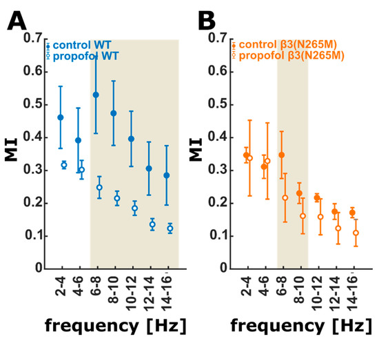 MI analysis indicated significantly reduced shared information content between the cortex and hippocampus with propofol in the 6–16 Hz oscillation range in wild-type animals. This reduction may be explained by the observed drop in PLV at these very frequencies with propofol. Synchrony and hence possibly the strength of cortico-hippocampal interaction become reduced. This reduction consequently leads to reduced information that is shared between both regions. The shared information is also reduced by propofol in the β3(N265M) mice, but to a lesser degree and in a narrower frequency range as in the wild-types.