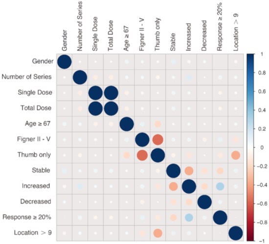 The Kruskal–Wallis (α = 0.05) tests were used to evaluate the difference among groups on the best improvement during therapy using ggpubr (version 0.2.5) (p < 0.05). Univariate and multivariate logistic regression was used to evaluate the adjusted association of the single dose and the best improvement (thumb only, fingers II–V, both) (glm.fit function). A correlation analysis of the factors in each group was performed by ggcorrplot (version 0.1.3). Data management was performed using the IBM SPSS software for MS Windows (SPSS Inc. Chicago, IL, USA, version 21). All analyses were carried out using R version 3.6.1 (R Foundation for Statistical Computing) and related packages. p ≤ 0.05 was considered to be statistically significant.