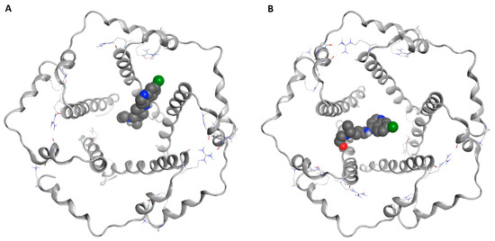 The ionic channels undergo significant conformational changes so that they perform their biological role. These membrane proteins have high plasticity, and some amino acids perform essential functions for the passage from closed to open state. During the MD simulation, we noticed a change in the volume of the central tunnel (the CQ led to an increase in the volume of the central lumen of 31.8%), while HCQ reduced the volume of the cavity by 28.14%. Both values refer to the volume of the central cavity of the protein without any ligand inside after 20 ns of MD simulation. We hypothesized that the two drugs interact differently with some central lumen residues, influencing its ability to change its conformation during its functionality. Probably, CQ could destabilize the ion channel structure by removing Phe26 residues from the center of the cavity, causing an expansion of the ion channel; conversely, the hydrophobic interactions of HCQ with the Phe26 (A–E) residues increase the stability of the central pore by bringing the chains of the pentameric structure closer, causing a reduction in the internal volume.