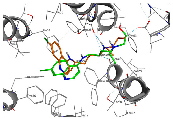 Three-dimensional (3D)-interaction diagram of HCQ in the docked pose (green) and average pose during molecular dynamics (MD) simulation (orange) with the E protein.