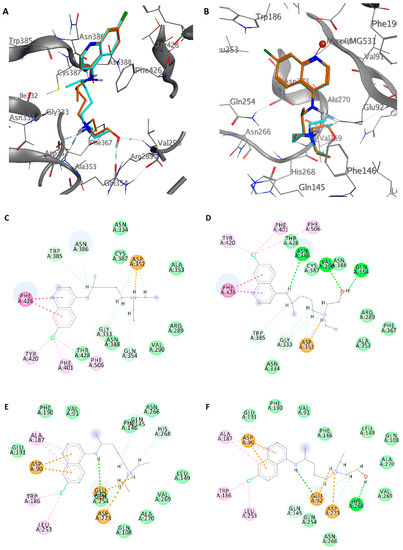 Interaction profile of the best-docked poses for CQ (blue) and HCQ (orange) in the N7-MTase (A) and ExoN (B) domain. Two-dimensional (2D) interaction diagram of CQ (C) and HCQ (D) in N7-MTase domain, and CQ (E) and HCQ (F) in ExoN domain.