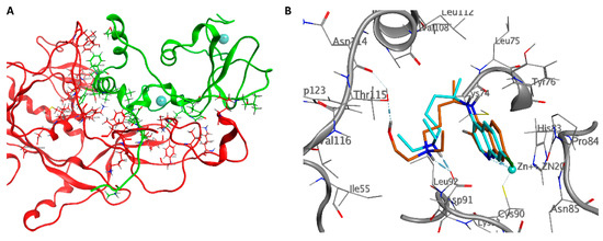 (A) Intermolecular interactions between nsp14 (red) is stabilized by nsp10 (green). Zinc ions are represented as blue spheres. (B) Docked poses of CQ (blue) and HCQ (orange) are shown with the residues of the binding pocket and the residues interacting with the nsp10 cavity.