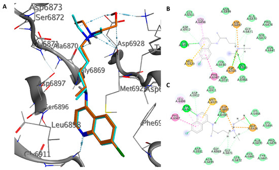The crystal structure of the nsp10/nsp16 methyltransferase (PDB ID: 6W6L) of SARS-CoV-2 was used for docking purposes. The docking results we obtained show that the two drugs have a very similar pose inside the pocket that binds SAM, despite the hydroxyquinoline having a better energy binding (−8.1 versus −7.6 kcal/mol). The quinolinic ring shows a hydrogen bond with the amide residue Cys6913 and hydrophobic interactions with Leu6898, Phe6947, and Met6929. The tertiary amino nitrogen atom of CQ forms a salt bridge with Gly9869, while that of HCQ with the carbonyl oxygen of Asp6928; the alcoholic group of HCQ forms hydrogen bonds with the carboxylic residue of Asp6928 (1.87 Å) and the amino group of Lys6869 (1.98 Å) (Figure 5). Probably, the further interaction of the hydroxyl group in the HCQ, inside the enzyme pocket, increases the affinity of the drug.