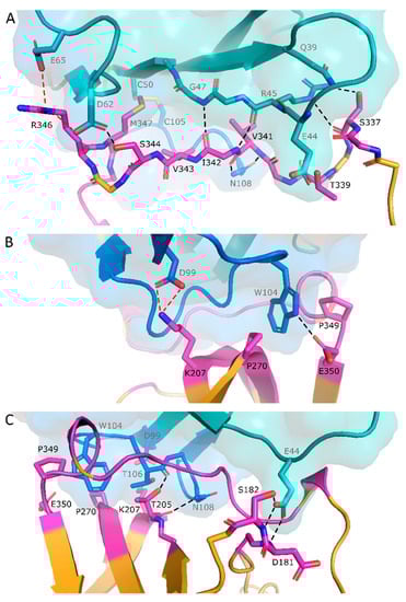 Interaction interface between PAI-1 and Nb93. (A) Detail of the interaction between Nb93 and the RCL of PAI-1; (B,C) Detail of the interaction between Nb93 and residues located in the direct environment of the RCL of PAI-1. PAI-1 is colored orange, with residues closer than 4 Å to Nb93 in magenta. Framework regions of Nb93 are in teal; CDR1, CDR2, and CDR3 are in yellow, brown, and blue, respectively. Hydrogen bonds are indicated by black dotted lines; salt bridges are indicated by red dotted lines.