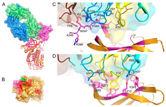 Crystal structures of the PAI-1/Nb93 complex and the PAI-1/Fab-MEDI-579 complex. (A) Superimposition of the structures of the PAI-1/Nb93 (magenta) complex and PAI-1/Fab-MEDI-579 complex (PDB ID 6I8S) [19]. In the latter complex PAI-1 is orange; the heavy and the light chain of the Fab fragment are colored green and blue, respectively. Together with the cartoon representation, the biological surfaces of Nb93 and the Fab fragment are represented; (B) Surface representation of the top of the PAI-1 molecule with the indicated contact regions (residues closer than 4 Å) for MEDI-579. MEDI-579 binds to the C-terminal part of the RCL in red and has adjacent contact regions in magenta (Tyr210, Glu212, Tyr220, and Tyr241) and green (Leu269, Pro270, and Arg271); (C) Detail of the interaction between MEDI-579 and the RCL of PAI-1; (D) Detail of the interaction between MEDI-579 and residues located in the direct environment of the RCL of PAI-1. PAI-1 is colored orange, with residues closer than 4 Å to MEDI-579 in magenta. Framework regions of MEDI-579 are in green and cyan for the heavy and light chain of the Fab fragment, respectively; CDR1, CDR2, and CDR3 of the variable heavy (VH) and variable light (VL) domain are colored yellow, brown, and blue, respectively. Residues located in the VL domain are cursive. Hydrogen bonds and salt bridges are indicated by black and red dotted lines, respectively.
