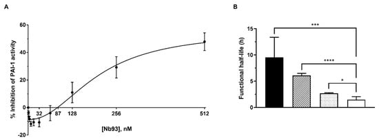 Evaluation of the inhibitory and stabilizing effects of Nb93 on active PAI-1. (A) Biphasic dose–dependent response of Nb93 on wild-type PAI-1 (PAI-1-wt) activity, characterized by a stabilizing effect at concentrations below and an inhibitory effect at concentrations above 87 nM; (B) The functional half-life of active PAI-1-wt in the absence (open bars) or the presence of 64 nM Nb93 (black bars), 32 nM Nb93 (hatched bars) or 64 nM Nb42 (dotted bars). All data are represented as mean ± SD; n ≥ 3. * p < 0.05, *** p < 0.001, **** p < 0.0001.