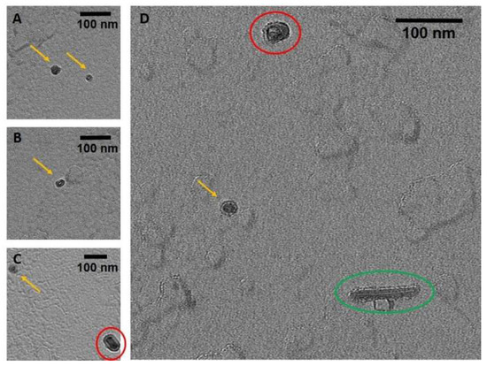 TEM images of the stab-1 HCC oligomers. Selected TEM images of the stab-1 HCC doughnut-like oligomers stained with uranyl acetate (yellow arrows, panels (A–D)) showing representative species present in the samples. Small numbers of short fibrils (green oval, panel (D)) and higher molecular weight oligomers (red circles, panels (C,D)) are also evident. Scale bars are 100 nm in each case.