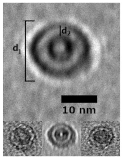 TEM and AFM images were used to determine the overall geometric parameters of the stab-1 HCC oligomers that were isolated from size exclusion chromatography and correspond to 10–12 subunits. These samples provided the reference data for the construction of the initial molecular models of the oligomers. Representative TEM images, illustrating the morphology of the oligomers, are shown in Figure 1. It is clear that a number of small, ring-like aggregates are present within the sample and that the predominant species appear to be approximately circular, having a diameter of 20–30 nm with a distinctive central cavity, in agreement with previous observations [31]. Some larger oligomers, of the order of 50 nm in diameter, and also the occasional short fibrillar species (Figure 1) can be observed, though much less frequently. Analysis of numerous TEM images at higher resolution (Figure 2) again reveals examples of circular, doughnut-shaped oligomers with differing sizes, with the smallest about 16–17 nm in diameter (d1) and the largest are about 20–24 nm. For the oligomers analyzed in detail, the distance between the edge of the central cavity and the inner edge of the outer ring (d2) is quite similar (~5–6 nm) (Figure 2); this value corresponds very well to the cross-sectional diameter of one cystatin C molecule in the crystal structure [14].